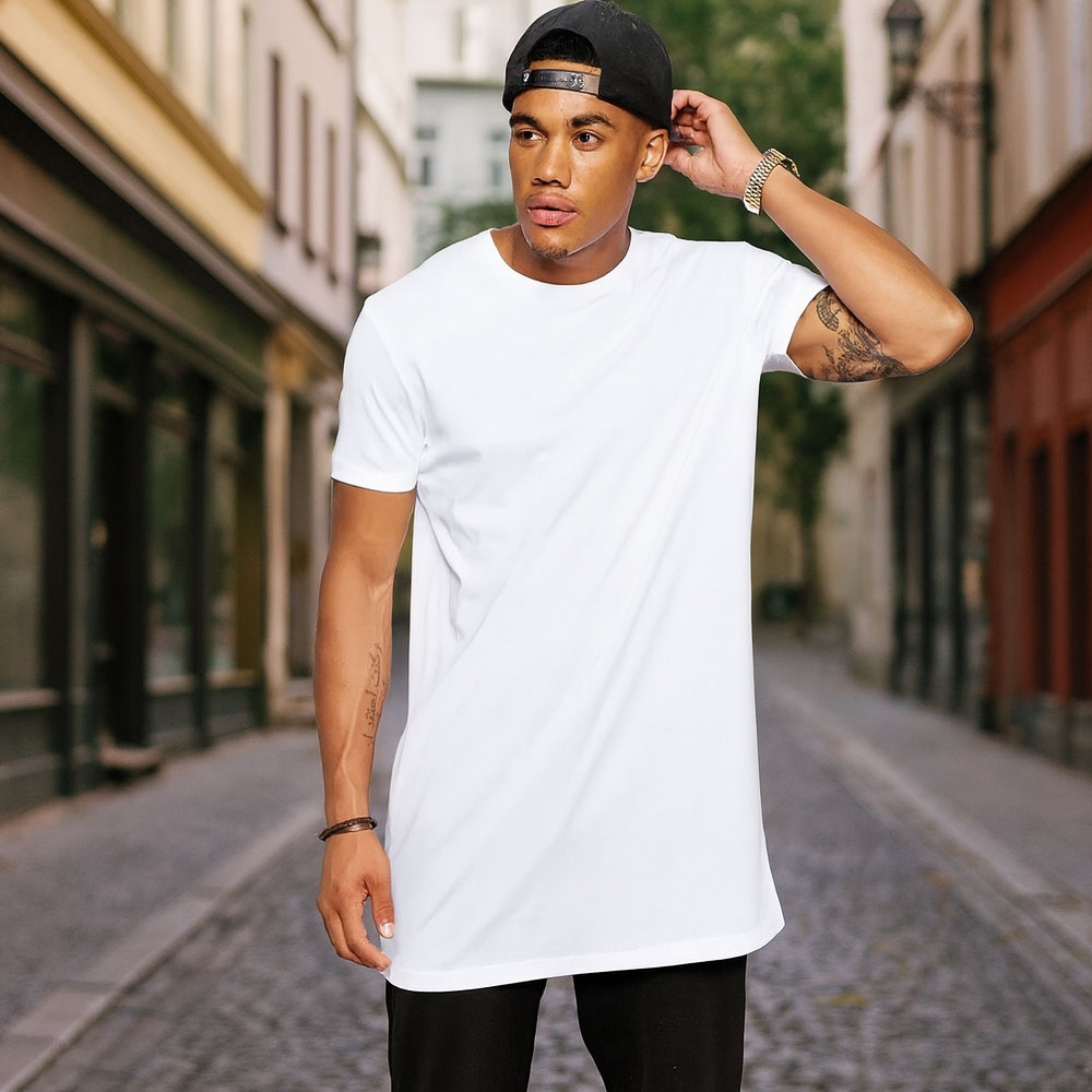Designed with extended length and often curved hems, this model is favored in modern street fashion. It offers a stylish edge to basic T-shirts and works well for tall or fashion-forward consumers. Frequently used in music and youth apparel lines.